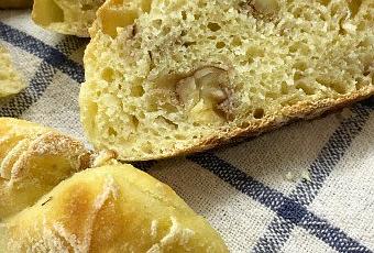 Prendiamo una ciotola capiente, mettiamo la farina il lievito ed il cucchiaino di zucchero, misceliamo bene ed aggiungiamo l’acqua tiepida (se usate il lievito di birra fresco scioglietelo nell’acqua), ora con l’aiuto di una forchetta mescoliamo velocemente senza badare troppo ad amalgamare il tutto, otterremo un impasto granuloso. Copriamo e lasciamo lievitare al chiuso per circa 2 ore (se avete più tempo diminuite la dose di lievito ed aumentate il tempo di lievitazione), trascorso il riposo necessario riprendiamo l’impasto ed aggiungiamo le noci tritate grossolanamente, poi con l’aiuto di un po’ di farina di semola lavoriamo i due filoni e li disponiamo sulla leccarda del forno lasciandoli riposare ancora una mezz’ora.