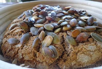 Prima si stende poi si piega per il lato lungo in tre, e ancora una volta il lato che è diventato lungo nuovamente in tre. Lascio a lievitare con questa forma. Dopo 2 ore ho nuovamente disteso l'impasto e ripetuto la piegatura. Questo tipo di pieghe servono per dare aria al pane durante la lievitazione e a creare i buchi nella mollica del pane. Essendo farine non facili, ho cercato di facilitare la lievitazione anche in questo modo. Dopo 5/6 ore ho infornato. Ho messo l'impasto su di una teglia infarinata ed ho cosparso con i semi di zucca precedentemete messi in ammollo. Posso inumidire con una spennellata di acqua e se i semi sono sufficientemente bagnati si attaccheranno perfettamente all superficie superiore della pagnotta. Il forno è caldo a 230° e lascio andare per 15 minuti, poi abbasso a 200 e lascio cuocere per un'altra mezza ora. Spengo il forno e lascio freddare.....