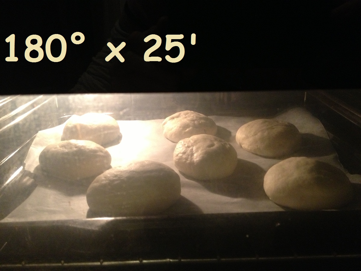 Far lievitare fin quando il panetto non avra' raddoppiato il suo volume (cisca 1 ora e mezza). Una volta pronto l'impasto, dividerlo in panini di circa 130 g l'uno. A me ne sono venuti 7. Disporli su una placca coperta con carta da forno e farli lievitare in forno acceso a 30° (solo la luce) x circa 30 minuti.