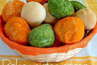Per l'impasto verde :ho cucinato la sera prima gli spinaci in un tegamino senza niente solo con un pò di sale li ho scolati e strizzati bene e ridotti in purea nel robot. Ho versato 250 gr di farina nella planetaria, ho sciolto il lievito(mezzo panetto) nell' acqua tiepida e l'ho aggiunta nella farina impastando a velocitò bassa. Ho aggiunto l'olio, lo zucchero e il sale e gli spinaci e ho continuato ad impastare sempre a velocità bassa (3) per circa 15 minuti. Ho tolto l'impasto e messo in una terrina a lievitare per circa 1 ora. Poi ho preso la placca del forno, l'ho foderata con la carta da forno e ho messo tante palline di pasta-pane distanti tra loro. Li ho fatti lievitare ancora 30 minuti dentro il forno spento con solo la lucina accesa. Poi li ho fatti cuocere a 170° per circa 25 minuti