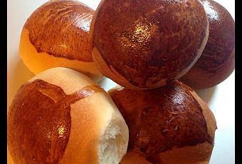 Impastare a lungo (almeno 10 minuti a mano, circa 6 con il Bimby). Lasciar raddoppiare (almeno un'ora, dipende dalla temperatura ambiente). Rovesciare sulla spianatoia e, senza rilavorare, appiattire con i palmi delle mani, piegare una delle estremità verso il centro, poi, ponendo i pollici orizzontalmente con le punte che quasi si toccano, spingendo contro il piano di lavoro arrotolare la massa. Tagliare in pezzature regolari da 40 (o 60) gr, a seconda delle necessità. Quelli da 60 sono da "merenda", gli altri da buffet. Formare palline tese, e mettere ancora a lievitare. Quando sono raddoppiati, e anche più, di volume, spennellare con tuorlo d'uovo sbattuto con alcune gocce d'acqua. Informare a 210/220° per 12 minuti circa, finché sono ben dorati sopra e ancora bianchi tutto intorno.
