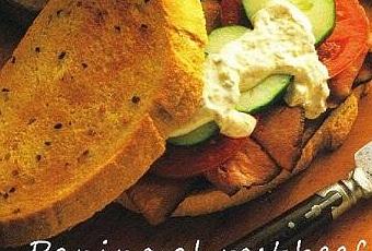 Amalgamate bene in una ciotola la panna acida, la senape di Digione e la salsa di rafano. Mescolate in un altro contenitore il burro e l'aglio, spalmate il composto su ogni fetta di pane. Posate poi il pane su una piastra da forno con la parte imburrata rivolta verso l'alto e mettetelo sotto il grill per 3 o 4 minuti finché non sarà tostato. Mettete, per preparare i panini, su una fetta di pane 3 fette di roast beef, 2 di pomodoro e 3 di cetriolo. Coprite con 2 cucchiaiate di preparato con senape e panna acida e poi adagiate sopra il tutto l'altra fetta di pane con la parte tostata rivolta verso l'alto.