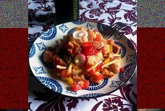 I toscani in ascolto non si facciano venire un sintomo. Questa è la mia versione della panzanella, in cui il pane non è sciocco –ma, giurin giuretta, è molto molto buono – e ci metto anche il peperone. In compenso l’olio è quello, ottimo, del Consorzio dell’olio extravergine Toscano. Mi avete perdonato, vero?