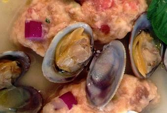 Per prima cosa ho messo le vongole in una ciotola capiente con acqua e sale in modo da pulirle da eventuli residui di sabbia e le ho tenute a bagno un paio d’ore, avendo cura di cambiare l’acqua due o tre volte. Ho messo, poi, a bagno il pane in una ciotola d’acqua fredda, fino a renderlo morbido. L’ho strizzato bene con le mani, ripetendo due volte l’operazione per renderlo il più asciutto possibile. Al pane ho aggiunto poi il pomodoro tagliato a cubetti, il cetriolo e la cipolla tagliati a pezzettini. Ho condito, poi, la panzanella ottenuta con olio, l’aceto, il sale e il pepe. In una padella capiente ho messo a scaldare l’olio e lo spicchio d’aglio e una volta che l’aglio ha iniziato a rosolare ho aggiunto le vongole, che avevo ben risciacquato sotto l’acqua, nella padella. Ho coperto e ho lasciato cuocere qualche minuto a fuoco vivo fino ad completa apertura delle vongole. Ho impiattato in un piatto fondo per poter servire le vongole con il loro sugheTTo, accompagnate da un paio di quenelle di panzanella. Ho terminato con un giro d’olio.