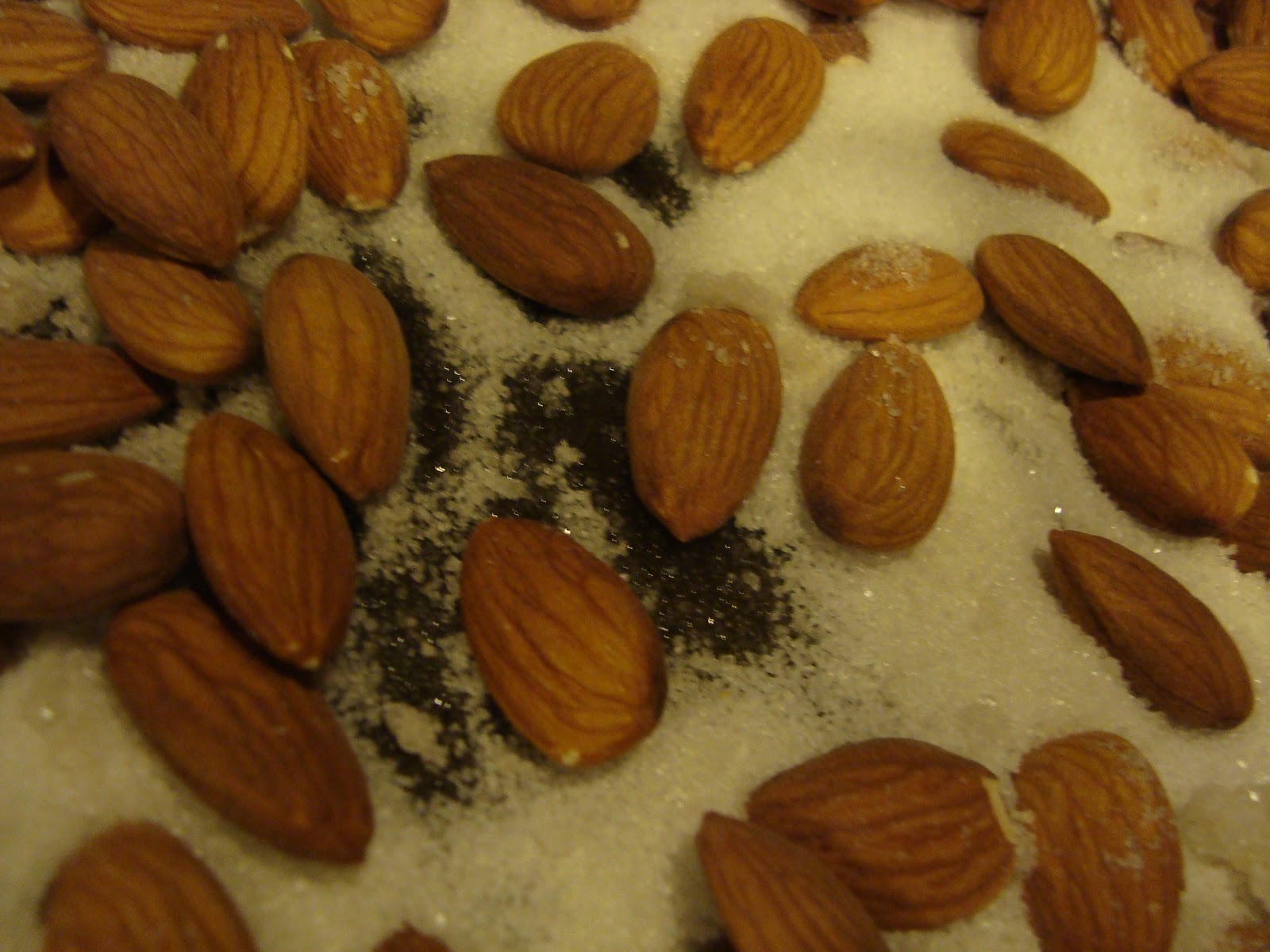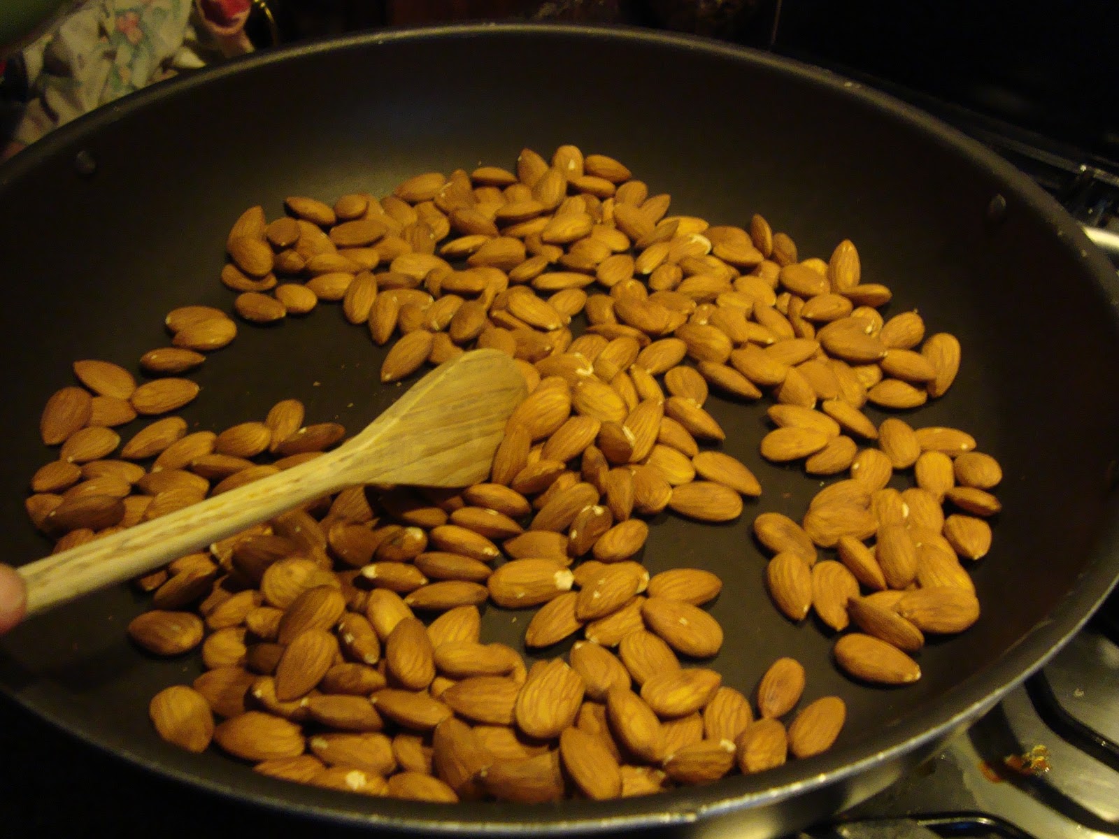In una,capiente,padella tostare le mandorle.Unire,quindi lo zucchero semolato...