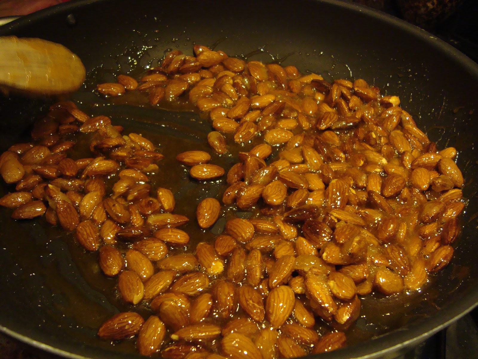 ....in modo da far aderire il caramello alle mandorle.Trasferire il tutto su un vassoio d'acciaio,leggermente unto con olio,e livellare.