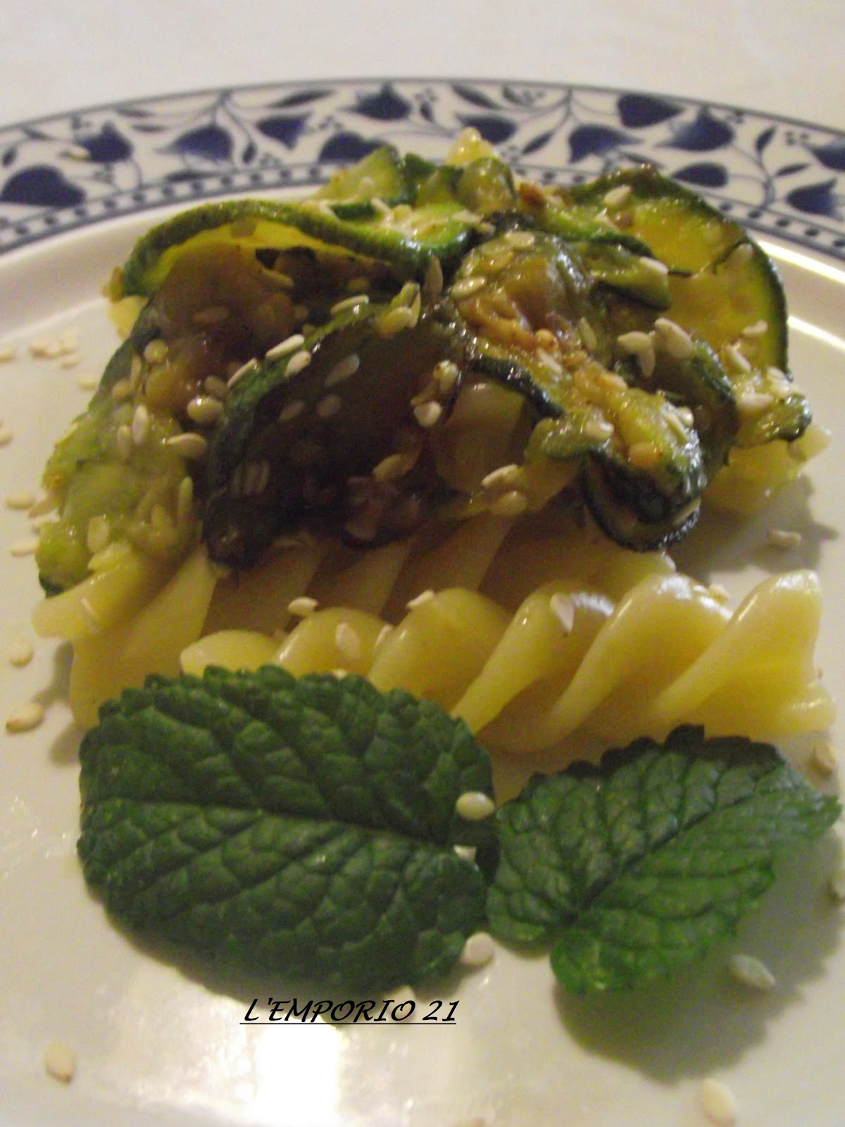 foglie di mentaIn un padellino fate tostare i semi di sesamo e metteetli poi da parte.Soffriggete poi uno spicchio d'aglio in due cucchiaiate di olio e aggiungete le zucchine tagliate a rondelline .Portate a cottura,spegnete il fuoco e aggiungete delle foglie di menta spezzettate.Scolate la pasta,mantecatela con le zucchine e la menta.Aggiungete i semi di sesamo e....Buon Appetito!!!