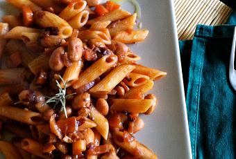 - 500 gr di penne integrali- 1/2 cespo di radicchio- 250 gr di fagioli borlotti già cotti- 250 gr circa di polpa di pomodoro- 1 spicchio d'aglio- 1 cipolla rossa- 1 rametto di rosmarino- 1 peperoncino secco- 1 bicchiere di vino rosso-sale, pepe- 1 cucchiaino di zucchero di canna- olio EVO