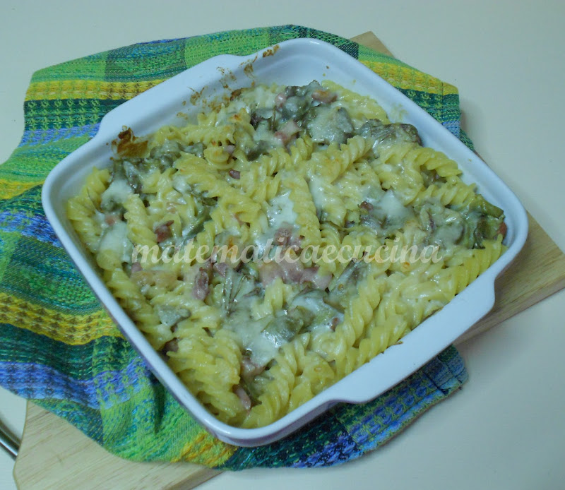 Versate la besciamella sulla pasta e mescolate bene. Aggiungete anche i carciofi e la pancetta.