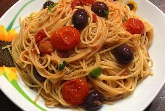 Preparazione: mettere in una larga padella l'olio e l'aglio vestito (con la buccia) che dopo qualche minuto toglieremo. Inserire i pomodorini tagliati a metà, le olive e i capperi, salare, aggiungere l'origano e il peperoncino in polvere. Lasciare cuocere almeno dieci minuti a fuoco dolce e schiacciare con i rebbi di una forchetta i pomodorini in modo da far uscire un po' di sughetto. Far lessare gli spaghetti in abbondante acqua salata. Scolare leggermente al dente e mettere direttamente dentro la padella con il sugo. Inserire qualche cucchiaio dell'acqua di cottura della pasta. Mescolare per far insaporire bene gli spaghetti, aggiungere il pecorino e, infine, il basilico spezzettato. Molta resa con poco sforzo......meglio di così!!!! Adesso vado, vi aspetto sempre qui, a presto!!!!