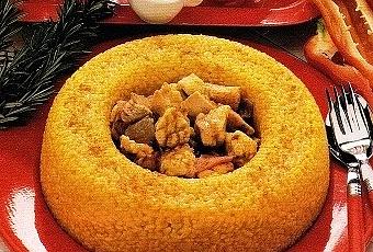 Mettete in questo caso, nella casseruola, burro, olio, cipolla; unite poscia polpa di manzo tritata fina, salate; bagnate con brodo; e cucinate. Volete il pasticcio ricercato? Quello che costa tanto? Con burro e un po’ di cipolla, fate allora cucinare creste, animelle, fegatini, filoni e funghi, tagliati a pezzi; bagnate con brodo ristretto; e leggermente salate. Volete il pasticcio… in una via di mezzo? In quest’ultimo caso, ricorrete ai funghi, alla carne, allo stomaco e al fegatino di quel pollo che avrete forse lessato per averne il brodo. Preparato l’uno o l’altro intingolo saporito, per… legarlo unite un torlo e mescolate. In una scodella sbattete, con 3 cucchiai di burro appena liquefatto, 2-3-4 torli (il numero varierà con il variare di ciò che sarà dentro al borsellino); e, in un’altra scodella, montate a neve tutti gli albumi. Unite al riso torli ed albumi sbattuti; e mescolate. Imburrate uno stampo da bodino; spolveratelo con pane trito; tappezzatene fondo e pareti con quasi tutto quel riso sì ben