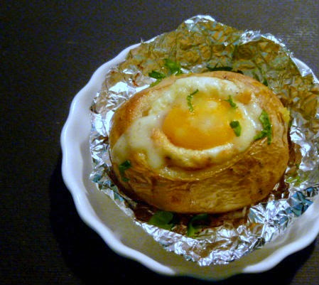 Ingredienti:- 3 patate di circa 150 gr. ciascuna- 2 uova - 50 gr. di formaggio asiago- 20 gr. di burro- 2 cucchiai di panna da cucina- sale- pepe nero macinato fresco- qualche foglia di prezzemolo tritatoProcedimento:Scegliere 3 patate rotonde, uniformi, di circa 150 grammi ciascuna. Lavarle sott'acqua corrente spazzolandole con uno spazzolino da cucina e asciugarle. Tagliare una piccola fetta sottile alla base di ognuna perché possano stare “in piedi”. Avvolgerle nella carta alluminio e cuocerle al forno a 190 gradi per circa 50 minuti. Toglierle dal forno, lasciare che raffreddino un poco, aprile la carta e avvolgerla intorno alla patata. Tagliare una calotta alla parte alta e con un cucchiaino svuotare la patata fino a tre quarti circa. Salare e mettere a ciascuna un po’ di burro.Tagliare la metà del formaggio a piccoli dadini. Rompere le uova e separare gli albumi dai tuorli. Sbattere leggermente gli albumi, incorporare la panna e unire il formaggio. Salare leggermente, pepare e e distribuire il composto nelle 3 patate. Rimettere al forno in modalità grill per 10 minuti. Trascorso questo tempo togliere dal forno, scavare un piccolo rientro nel composto che nel frattempo si sarà abbastanza gonfiato e sistemare sopra un tuorlo. Spargere sopra il resto del formaggio tagliato a dadini (io ho ricavato dei trucioli con il gadget per la julienne di verdure) e rimettere in forno, sempre modalità grill per circa 3 - 4 minuti o anche di più se volete il tuorlo più sodo.Togliere dal forno, spargere un poco di prezzemolo tritato e servire calde nel cartoccio.