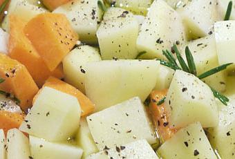 Unire in una teglia ben oliata patate, zucca, aglio, rosmarino, abbondante pepe nero e mischiare.