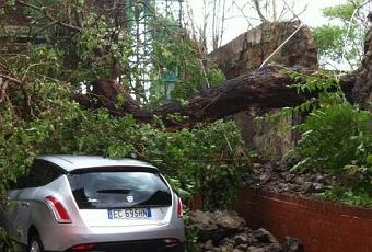 “La macchina era parcheggiata all’ interno del Parco Primavera sito al corso Garibaldi 185. L’ albero del giardino adiacente si è divelto facendo crollare il muro di divisione del Parco Primavera dal giardino di Villa Bideri ed il tutto é crollato sulla mia Delta ormai fuori uso. Mio marito aveva parcheggiato un minuto prima che succedesse il fatto, rientrando a casa proprio per il malempo, quindi direi un vero miracolato. Ho chiamato subito i pompieri che mi hanno detto che appena si sarebbe libererata una squadra me l’avrebbero mandata, ma ad ora non si è visto ancora nessuno, troppo impegnati in giro” .