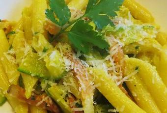 Un primo piatto semplice e veloce, caratterizzato dallo zafferano e da mix di zucchine, pomodoro e speck.