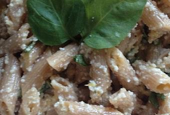 Buttate 500 gr di pennette integrali di buona qualità e, dopo 5 minuti circa, aggiungete nella vostra ciotola 5/6 cucchiai di acqua di cottura e mescolate, poi aggiungete una manciata di foglie di basilico fatte a pezzi grossolanamente con le mani.