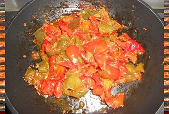 Quando saranno appassite unite i peperoni lavati e tagliati a listarelle, fateli appassire, quindi unite i pomodori tritati e salate.