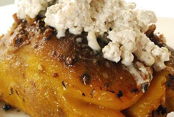 Nel frattempo abbrustolisco sul fuoco i peperoni e li spelo. Tolgo il "tappo" e i semini.Preparo la salsa di noci.Grattugio il formaggio e lo mescolo con i 50 gr di noci rimaste. Ora nel libro dice che il tutto dovrebbe essere macinato con la panna sul metate. Una via di mezzo tra pestello e mixer preistorico :-D. Se volete vederlo è qui .Visto che non posseggo tale attrezzo ho deciso di montare la panna (senza zucchero!!) e di aggiungervi poi formaggio e noci. farò questa operazione pochi minuti prima di portare in tavola.