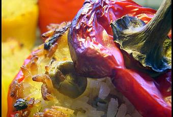 -4 peperoni di media grandezza -200 g. di riso -80 g. olive denocciolate -20 g. capperi -15 g. alici sottolio da tagliare a pezzettini piccini piccini -350 g. di cipolle (la prossima volta ne metto almeno il doppio!) -30 g. parmigiano grattugiato -100 g. provolone piccante o affumicato (che a detta della mia amica è meglio) da tagliare a dadini-piccini -4 cucchiai di olio evo -sale q.b. -pepe q.b