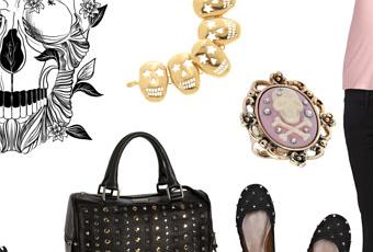 Teschi, borchie e tanto nero per un look grintoso ma ricercato. Gli accessori, anello e bracciale, riprendono e si amalgamano bene al colore della t-shirt. Originalità e ricercatezza per un outifit che vuole fare la differenza.