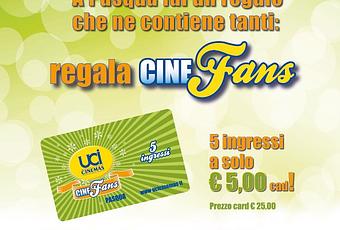 CINEFANS PASQUA è disponibile al prezzo di 25 euro presso tutte le casse delle multisale UCI Cinemas, ad esclusione di UCI Curno, fino al 24 aprile 2013. La tessera ha una validità di 60 giorni dalla data di acquisto e può essere utilizzata tutti i giorni solo nella multisala UCI in cui è stata acquistata, per un massimo di 3 volte nello stesso giorno e solo per 3 ingressi per lo stesso film. CINEFANS PASQUA può essere utilizzata per gli acquisti e le prenotazioni online senza il pagamento del supplemento. Al suo esaurimento, la tessera non potrà essere ricaricata.