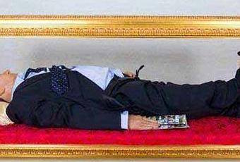 Berlusconi è disteso in una teca, su un tappeto di velluto, come fosse un papa o un santo, con gli occhi chiusi e il sorriso compiaciuto, come chi sta facendo un bel sogno. La mano destra poggia sull'ormai "mitico" opuscolo "Una storia italiana", che Berlusconi inviò a milioni di famiglie, la sinistra si insinua nei pantaloni aperti, a rivelare, scrivono gli autori, "il segno piu' intimo di un uomo totalmente preso e infine sopraffatto dalle pulsioni incontinenti della propria libido". Non solo: al completo blu con cravatta fanno da contraltare due improbabili pantofole di Topolino, a simboleggiare il carattere gioviale e barzellettiere dell'ex premier.