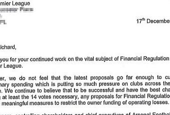 Quando i Presidenti delle squadre della Premier League si sono incontrati a dicembre per discutere le ultime proposte sul Fair Play Finanziario, hanno trovato una lettera ufficiale, su carta intestata dell'Arsenal e firmata da quattro squadre (Manchester United, Arsenal, Liverpool e Tottenham Hotspur) nella quale si sosteneva che le proposte in discussione non erano sufficienti, invitando ad un completo recepimento da parte della Premier League della normativa UEFA sul Financial Fair Play.