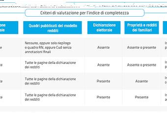 Il primo aspetto indagato è perciò la completezza delle dichiarazioni stesse: quanti sono stati vaghi e quanti invece hanno scelto di essere più trasparenti? È emerso subito che i “vaghi” sono molto più numerosi dei “precisi”, ma si è visto anche che alcuni sono stati tanto accurati e rigorosi da fornire informazioni più dettagliate rispetto ai laschi obblighi di legge in materia, che per esempio non prescrivono di includere notizie sul coniuge o di pubblicare i nomi di chi finanzia la campagna elettorale. Sono stati così individuati tre livelli di accuratezza delle informazioni diffuse: parziali, quando non è presente la dichiarazione dei redditi integrale oppure quando manca il rendiconto elettorale; complete quando i documenti richiesti dalla legge sono pubblicati in versione integrale; aggiuntive quando sono presenti dati supplementari, per esempio sui familiari. I documenti pubblicati da ciascun politico sono stati analizzati e di conseguenza valutati, in base alla disponibilità di informazioni, come scarso sufficiente o buono. Ogni singola valutazione è stata inoltre brevemente spiegata nelle schede dei singoli politici consultabili sul sito patrimoni.openpolis.it.