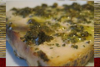Tritate cipolla, aglio e abbondante prezzemolo. Mettetene un po’ in una pirofila, sopra sistemate le trance di pesce, salate, pepate, ricoprite con il trito rimasto e condite con un bicchiere d’olio e uno di vino bianco. Cuocete in forno preriscaldato a 180°C per mezz’ora, bagnando spesso il pesce con il sugo.