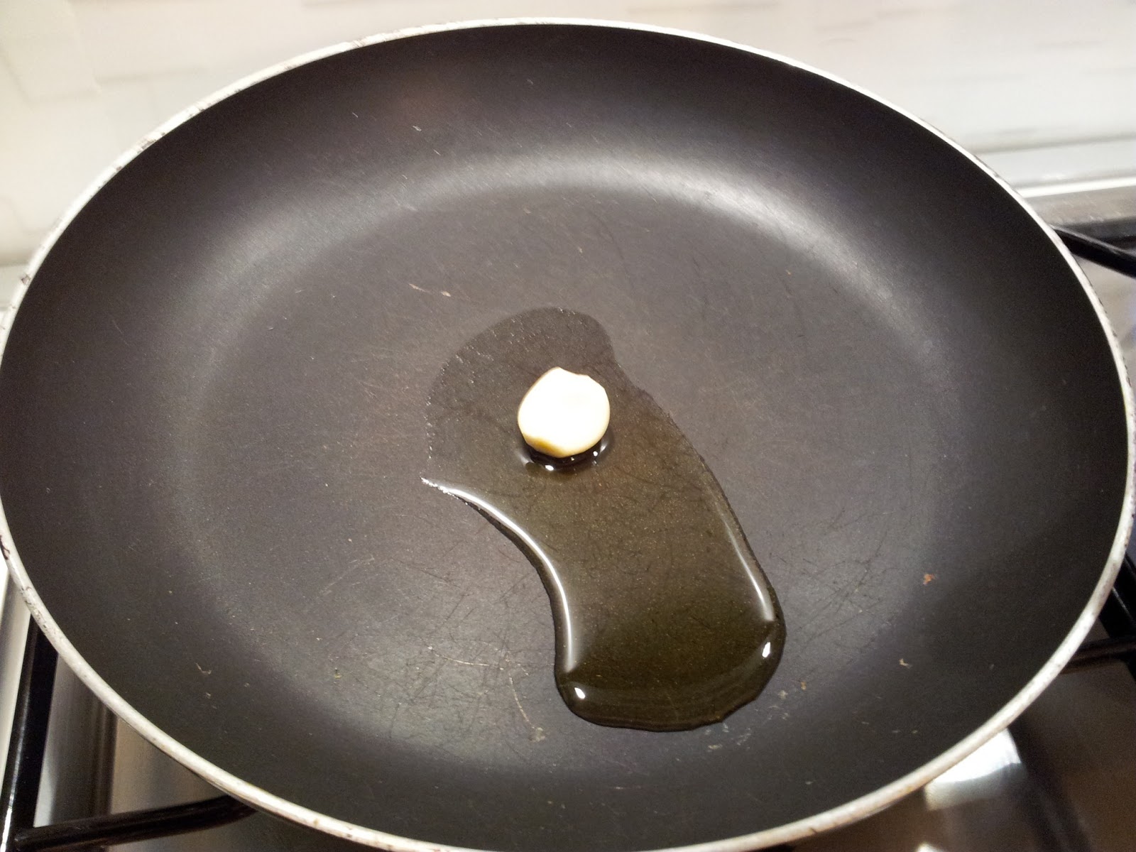 mettere in una padella il cucchiaio di olio con lo spicchio d'aglio e far rosolare per qualche minuto