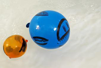 Abbiamo provato vari sistemi per far sì che rimanesse sott'acqua. Alla fine la soluzione migliore è stata mettere nel palloncino dei sassi e poi l'acqua facendo attenzione a togliere tutta l'aria prima di chiudere il palloncino. Decorare con pennarello indelebile.