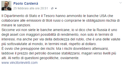 A proposito del rublo, una decina di giorni fa, sul mio profilo Facebook, avevo avvisato che valuta russa sarebbe potuta rilevarsi un'ottimo investimento, proprio grazie alla sua debolezza (in quanto è una delle valute più sottovalutate al mondo in termini reali) e per via del fatto che esistono emissioni obbligazionarie (anche di massimo rating) che offrono eccellenti tassi di interesse, idonei a compensare l'eventuale svalutazione.