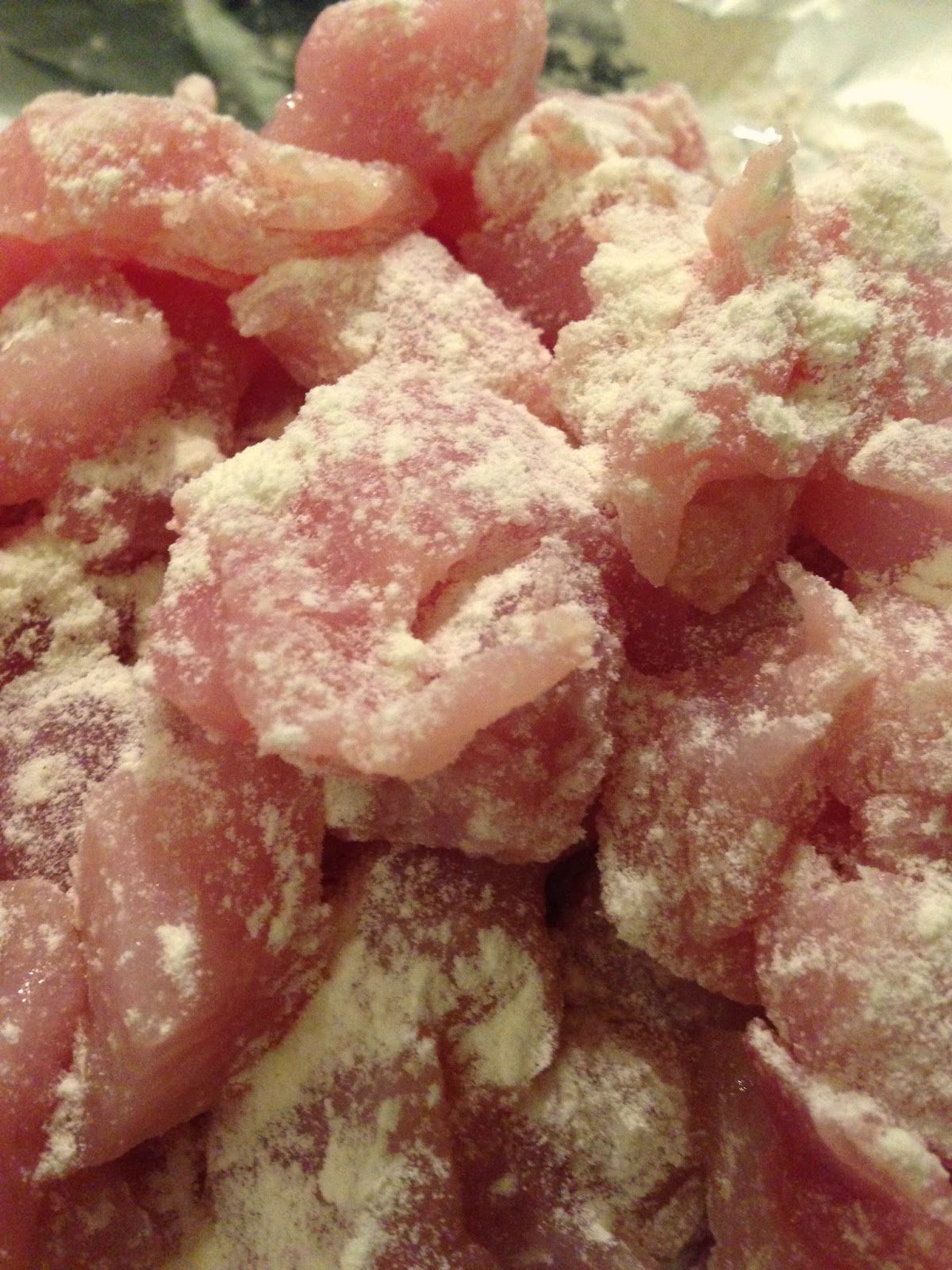 Tagliare a cubetti il petto di pollo ed infarinarlo