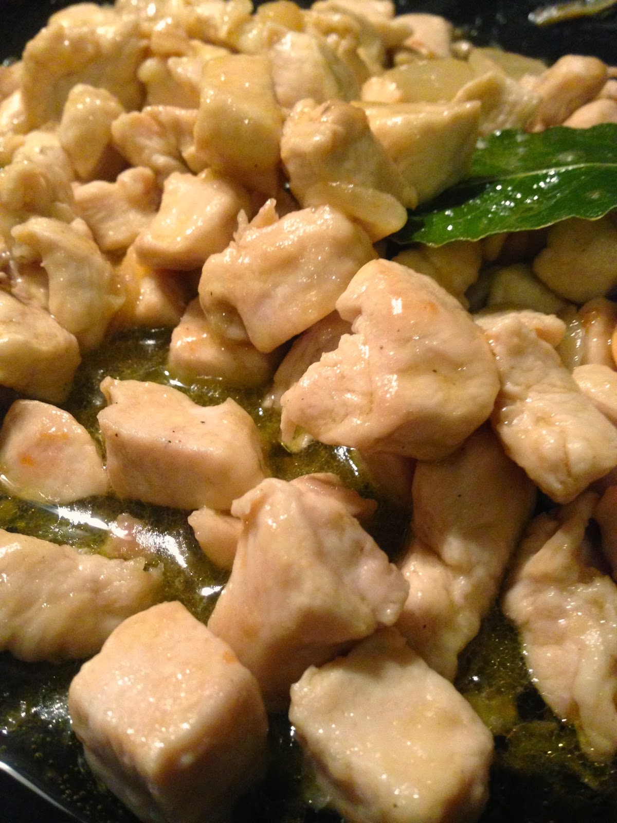 In una padella sciogliere il burro con l' olio aggiungere l'alloro e mettere i cubetti di petto di pollo a cuocere a fuoco vivace per circa 10 minuti, girandolo spesso.