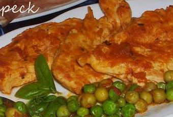 Tagliare a fette i petti di pollo ed ilnfarinarli. In una padella soffriggere la cipolla con lo speck, aggiungere le fettine di pollo e rosolarle da ambo i lati. Una volta che i petti saranno ben dorati, aggiungere la passata di pomodoro e i piselli. Regolare il sale. Continuare la cottura a fuoco basso e con il coperchio.