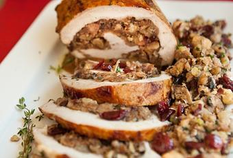 Si apre la maxi fetta di petto di tacchino, del peso di circa 1,400-1,600 kg e al centro si posiziona la farcia, si richiude, si lega con cura con lo spago da cucina e si fa rosolare in olio e burro con 2 foglie di alloro e 2 rametti di timo.