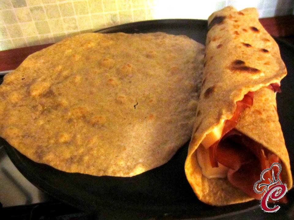 Adagiate una sfoglia alla volta sulla piastra, lasciandola cuocere a fuoco medio per un paio di minuti, quindi giratela e procedete per altri due minuti. Continuate la cottura fino a quando sarà sufficientemente dorata, quindi farcitela, sempre sulla piastra, arrotolatela (o piegatela, come desiderate) e lasciatela al caldo, mentre procedete con la cottura successiva. A piadine ultimate, tagliate in due ciascun rotolo, sistemate tutto su un tagliere e servite!!!!