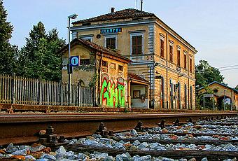 La stazione di Pianfei si trova ai confini della realtà. E’ in totale abbandono: i cessi (c’è scritto proprio cessi) sono murati, le porte sigillate, sul display degli orari appare una schermata di Windows 95. Ma la campanella suona prima dell’arrivo del treno e gli orari sono aggiornati: qui fermano i treni. Sembra incredibile ma è vero. Pochi treni, ovviamente. Ho sfidato i divieti della mamma e ho camminato sulle rotaie, mi sono anche sdraiato sulle rotaie. E questo è il binario 2 della stazione di Pianfei.