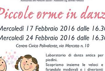 Mercoledì 17 febbraio e mercoledì 24 febbraio dalle 16.30 a Gradara (PU) in via del Mercato, si terranno gli incontri gratuiti Piccole Orme in danza, laboratorio di danza antica per piedini piccolini.