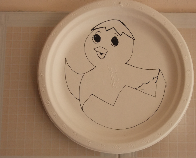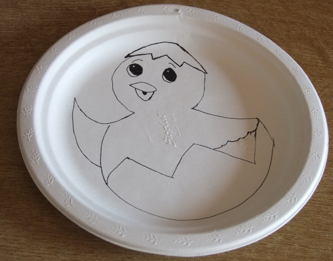 Ho realizzato un disegno su un foglio , successivamente la bambina ha ricalcato il disegno su un piatto di cellulosa utilizzando il LUMOCOLOR: