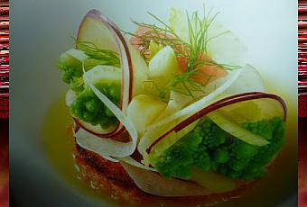 mondate il finocchio tenendo da parte un po' del verde tagliatene 40 g con l'affettatrice e mettetelo in acqua per farlo arricciare un po' tagliate a pezzi il rimanente e centrifugatelo con la polpa residua delle 2 mele 80 g di sedano un limone sbucciato ricavate dal pane dei dischi di 8 cm di diametro e tostateli in forno scottate il broccolo in acqua bollente salate per 5' raffreddatelo e conditelo con oli e sale