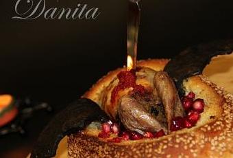 Posizionale la quaglia dentro il pane e finire con altri chicchi di melagrana e con le ali di pipistrello :-).