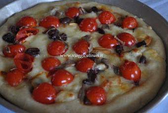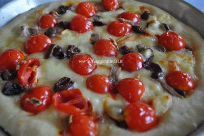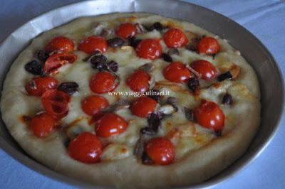 In tutte le cucine dovrebbe essere presente il "tegamino" di alluminio. Versatile, indistruttibile, si presta davvero a mille utilizzi: per la pastiera napoletana, la tortilla spagnola, patate al forno e...pizza! Ispirato da una nota trasmissione televisiva e voglioso di pizza, ho realizzato questa ricetta che è una tra le più semplici e veloci nella preparazione e cottura. Oramai la pizza non la compro più, preferisco farla in casa nelle sue molteplici varianti, anche se quando torno giù a Salerno, non appena metto piede in stazione vado a comprarmi una pizza e la piego a "libretto"!Potete farcirla come meglio credete o utilizzarla come focaccia, magari solo pomodoro, capperi acciughe oppure bianca con pomodorini e rucola, a voi la scelta. Avendo dei pomodorino biologici in frigo, delle olive taggiasche e un fiordilatte pugliese, ho optato per questa variante.