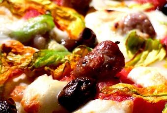 PREPARAZIONE Preparare l'impasto della pizza come indicato nella ricetta. Il giorno successivo scolare la mozzarella, tagliarla in quattro e tamponarla con carta assorbente. Tagliare a cubetti e cospargere con il parmigiano grattugiato. Scolare i pelati, strizzarli fra le mani e condirli prima di usarli con sale, pepe ed origano. Scolare le olive dall'olio. Pulire i fiori di zucca, eliminando il pistillo e dividerli a pezzi. Rosolare la luganega tagliata a tocchetti in una padella senza altri grassi. Stendere la pasta in una teglia ricoperta con carta forno e spennellata di olio e.v.o. Farla riposare per circa 3 ore a temperatura ambiente. Cuocere il guscio di pasta per 7/8 minuti a 250°C in forno ventilato, nella parte medio-bassa. Nel frattempo grigliare i tomini e tagliarli a spicchi. Condire i fiori di zucca con poco olio e.v.o., sale e pepe. Sfornare la pizza e farcire con i pelati, la mozzarella, i fior di zucca conditi, le olive, la luganega e i tomini. Rimettere in forno per altri 6/7 minuti nella parte centrale.