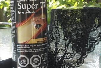 Misurate la quantità di pizzo che sarà necessario per fare il giro del vaso.Spruzzate tutto l'esterno del vaso di colla e poi attaccate il pizzo intorno, fissandoloall'estremità dove avevate iniziato.