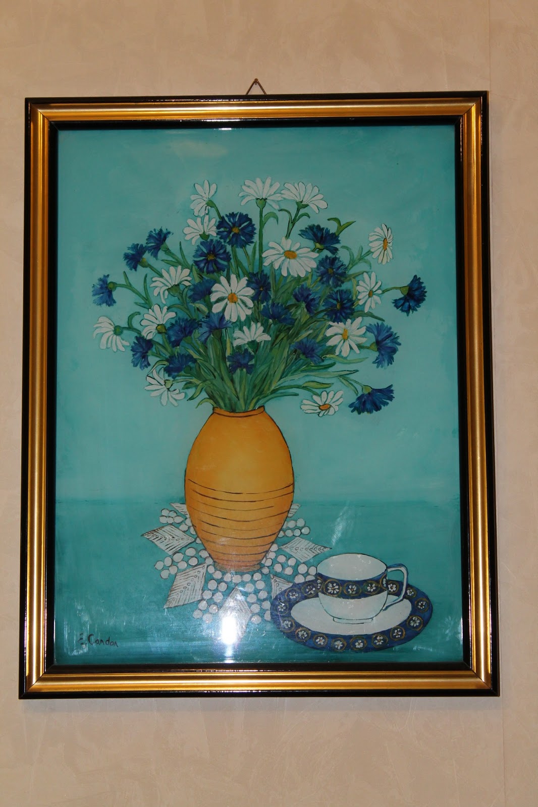 Quando ancora lavoravo, una delle accompagnatrici dei nostri gruppi verso i paesi dell'Est europeo era una splendida signorina rumena che oltre al suo lavoro amava dedicarsi ad un'arte che fa parte della tradizione rumena: la pittura naif su vetro.Le mie colleghe ed io eravamo tutte ragazze giovanissime non ancora sposate e lei, per darci un suo ricordo, regalò ad ognuna di noi un suo dipinto su vetro dicendoci che sarebbe stato il suo dono per una nostra vita a due. Alle mie due colleghe fece due icone, a me che invece ero la più piccola (avevo appena 19 anni) volle dipingermi una natura morta con una predominanza di turchese che sapeva fosse il mio colore preferito.