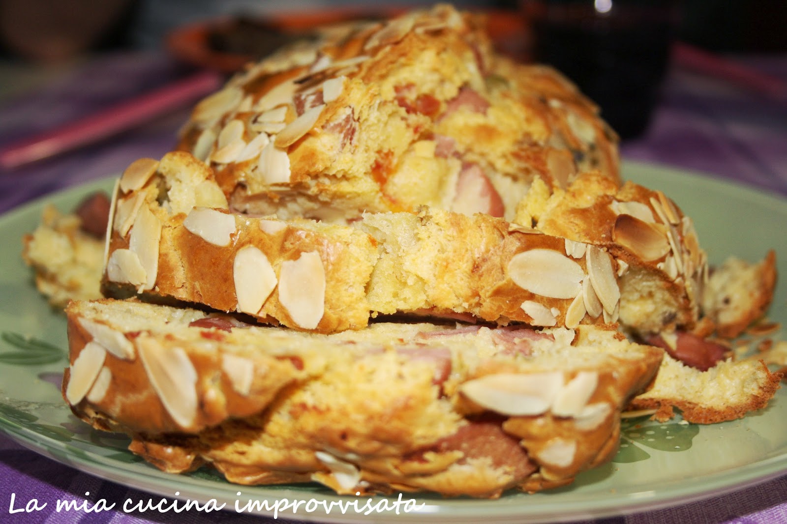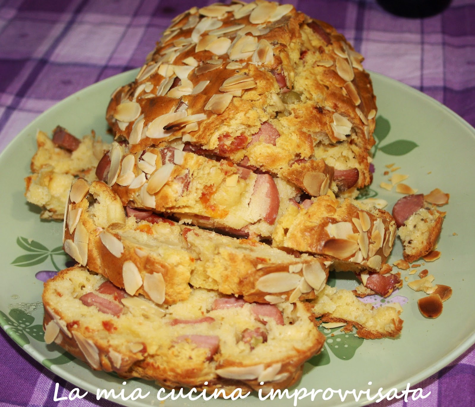 Ho riempito uno stampo da plumcake foderato da carta forno bagnata e strizzata, ho cosparso la superficie con una pioggia di mandorle a lamelle ed ho infornato a 180° in forno ventilato per 30 minuti circa.
