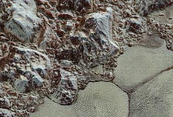 Lo strumento Long Range Reconnaissance Imager (LORRI) ha scattato le prime immagini circa 15 minuti prima dell’avvicinamento a Plutone (da 17 mila chilometri). I dati sono stati poi combinati con le immagini a colore (nel vicino infrarosso, rosso e blu) raccolte dal Ralph/Multispectral Visible Imaging Camera (MVIC) 25 minuti prima che LORRI iniziasse a scattare. Si tratta, infatti, di un’immagine composta da più scatti presi con una risoluzione di 77-85 metri per pixel e che rivelano dettagli molto piccoli sulla superficie di Plutone: fratture e rocce viste così da vicino che ci sembra quasi di sorvolare il pianeta con un drone. Per migliorare l’immagine sono stati aggiunti altri dettagli a colore e a bassa risoluzione (630 metri per pixel).