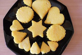 L'ho preso, ho letto e riletto le istruzioni per la preparazione e con mio stupore ho constatato che era già pronta solo da condire nei modi desiderati, il massimo per chi non ha tempo, ma non si vuole privare di alcuni sapori e prodotti tipici. Non essendo tipici consumatori di polenta, il modo più gustoso per farla conoscere a Marco è friggerla, anche se a me piace anche con la salsiccia e con il sugo, altri modi di condirla non li conosco. Il panetto era troppo doppio, così con un coltello l'ho tagliato a metà, poi ho tirato fuori gli stampini dei biscotti che avevano già utilizzato per i biscotti colorati, i biscotti allegri e per le tartine fantasia e ho chiamato Marco. Gli piace molto utilizzare gli stampini, penso sia comune a tutti i bambini, così subito si è messo al lavoro: