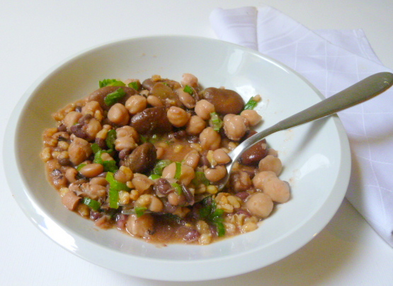 Prendiamo una manciata di legumi che abbiamo normalmente nella dispensa (fave, fagioli dell’occhio, ceci, lenticchie, piselli secchi) e dei chicchi di grano. Mettiamo a mollo in acqua fredda dalla notte precedente i ceci e le fave (separatamente). La mattina successiva scoliamo e mettiamo in una pentola e in acqua fredda a lessare prima i ceci per circa mezz’ora. Successivamente uniamo il resto dei legumi e ci regoliamo rispetto al grano, seguendo le indicazioni di cottura riportate sulla confezione.Quando saranno ammorbiditi, ritiriamo dal fuoco, lasciamo un poco intiepidire e condiamo con una vinaigrette di pomodoro come segue: incidiamo una croce su 2 pomodori polposi e li scottiamo per 2 minuti in acqua bollente; togliamo la buccia e frulliamo la polpa. Facciamo sciogliere un poco di sale in un cucchiaio di aceto balsamico, aggiungiamo 3 cucchiai di olio evo e il pomodoro frullato. Mescoliamo bene e versiamo sui legumi. Spargiamo sopra sia la parte bianca che verde di cipollotti tagliati fini, se vogliamo del prezzemolo o dell’aneto tritato.Nota: a nostro gusto, lo rendiamo più o meno brodoso.